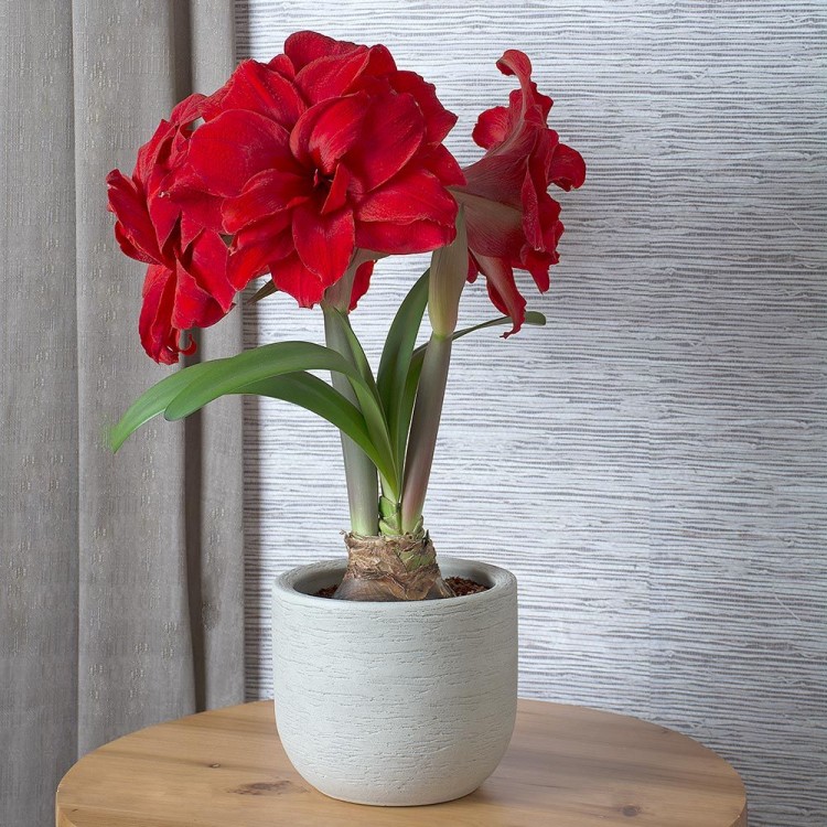 В высоту растение достигает 35 – 45 см. Каждая луковица может дать 2 – 3 цветочные стрелки. На макушке стрелки образуется по 4 – 5 бутончиков. Распускаясь, они превращаются в пышные махровые цветки, диаметром 15 – 17 см. Лепестки окрашены в глубокий темно-красный цвет. Листья у амариллиса сине-зеленые. Они красиво оттеняют и подчеркивают изящные бутоны. Многолетник источает приятный аромат.