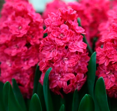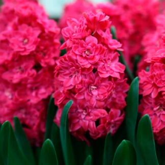 Гиацинт “Холлихок” – крупноцветковый, махровый, многолетний сорт. Луковицы гиацинтов крупного размера, отлично приживаются в любых условиях, отличаются обильным и ранним цветением. Цветки махровые, собранные в пышные соцветия, крупные, красно-малинового цвета. Растение невысокое, стебель прямостоячий, крепкий. Гиацинты получили огромную популярность из-за своей привлекательности, их выращивают в горшках в домашних условиях, в открытом грунте на клумбах, а также в воде.