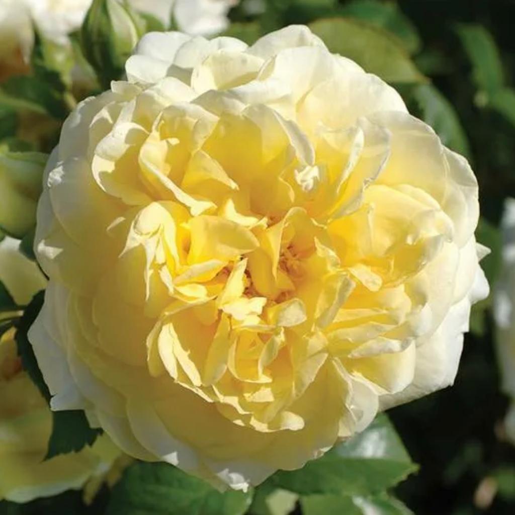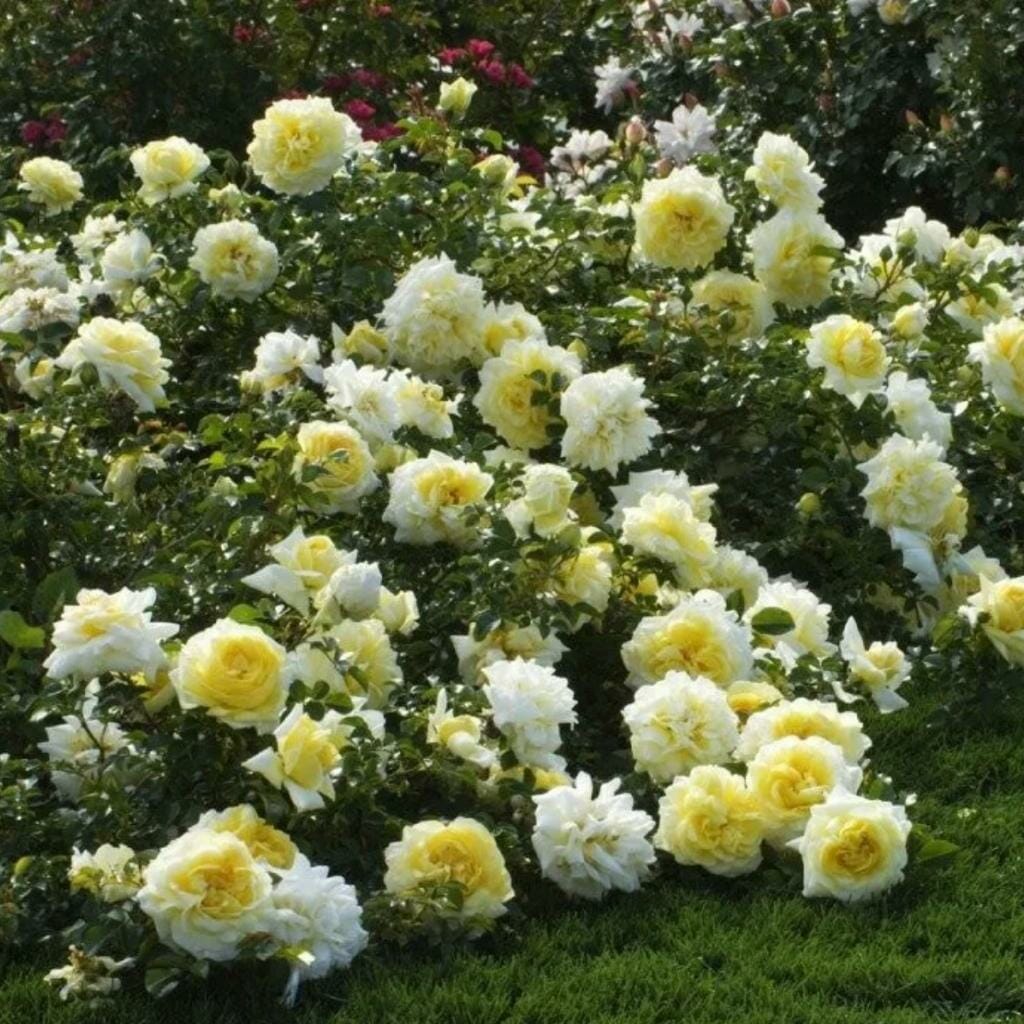 Куст густой, активно устилающий грунт на участке. В высоту он достигает 60 см, а в ширину – 80 см. Длина побегов варьирует в пределах 1,4 – 1,6 м. Листва ярко-зеленая, с блестящей поверхностью. На концах стеблей формируются густомахровые бутоны (состоят из 95 – 98 лепестков), бледно-желтого цвета. Распускаясь, они образуют пышные цветки шириной 10 – 12 см. Цветение довольно продолжительное – с первых чисел мая и до конца ноября. Аромат сладковатый, с приятными лимонно-фруктовыми нотками.
