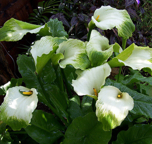 ПОСАДКА И УХОД. Каллы можно выращивать как горшечную культуру, так и садовую. Для посадки каллы подойдет притененный участок. Идеальный вариант, место под негустыми кронами деревьев. Чтобы было достаточно светло, а солнечные лучи не обжигали листьев. Очень эффектно смотрятся каллы, рядом с искусственным водоемом. Отлично цветет и растет только в тепле, где температура не ниже 18°C, самая оптимальная температура 22-23°C. Не переносит сквозняков. Цветоносы этого растения высокие, которые идут прямо от низа растения. На открытом воздухе это прекрасное растение цветет 1 месяц, а в закрытом помещении – 14 дней. Осенью растения сбрасывают листья. На зиму клубни каллы нужно выкопать и хранить в непромерзаемом помещении.