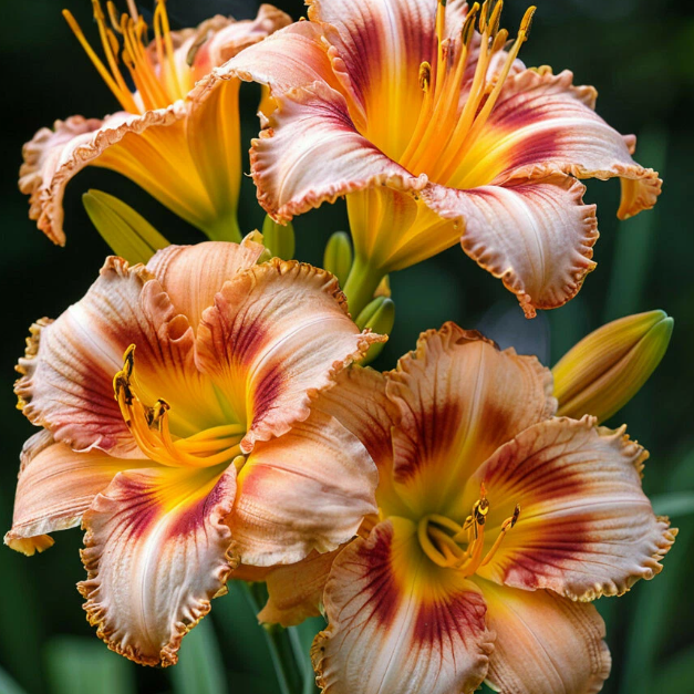 Окраска цветков лилейников поражает своим разнообразием: от нежно-кремовых и пастельных тонов до ярких красных, оранжевых, желтых, фиолетовых и даже почти черных. Часто встречаются двухцветные и многоцветные сорта с контрастными краями, полосками, глазками (окрашенное пятно в центре цветка) и другими узорами.