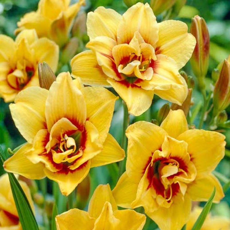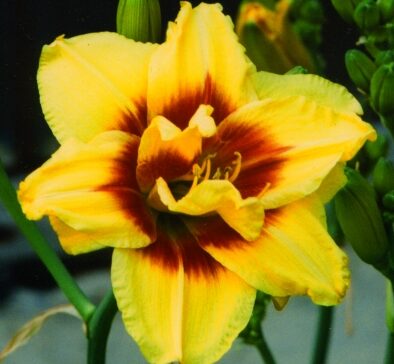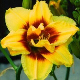 Саженцы неприхотливы, за ними легко ухаживать даже новичкам. В диаметре цветок достигает 14 см, в высоту — 60 см. Сезон цветения у растения средний, повторно-цветущий. По типу вегетации растение спящее, по типу размножения — диплоид. У лилйника золотисто-желтый цветок с большим темно-красным глазом на всех махровых и гофрированных по краям лепестках. Они имеют плотную структуру. Необходимы открытые, солнечные места для посадки или полутень, но при этом цветение будет не так обильно. Почва нужна увлажненная и удобренная перегноем.Зимостойкость: -40°С.