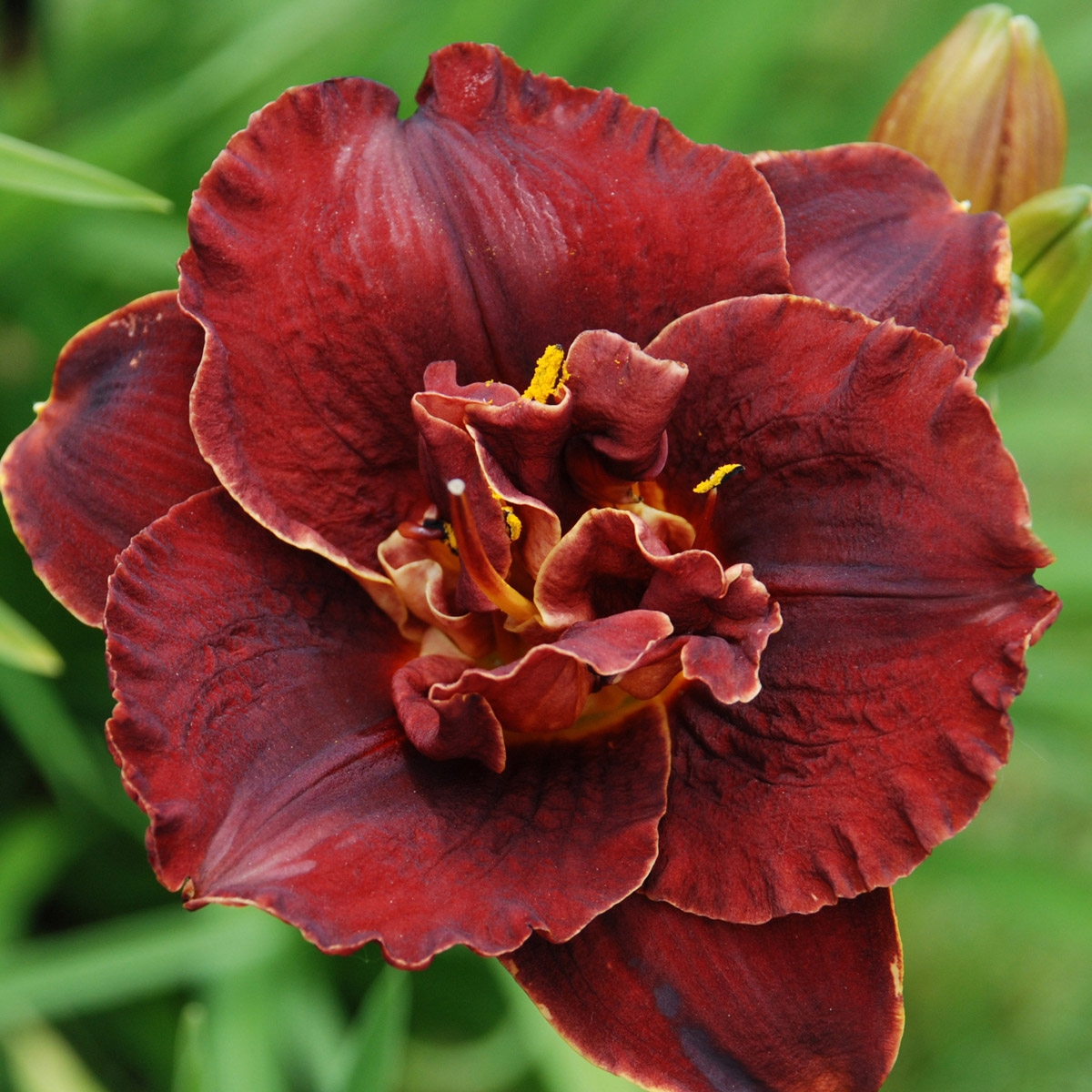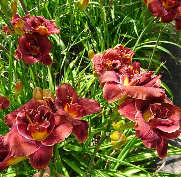 Обладает крупными воронковидными гофрированными махровыми цветками глубокого бордового цвета с тонкой изящной белой каймой. Листья узкие, мечевидные. Цветение обильное, повторное. Высота 60-80 см. Диаметр цветка 12 см. Зимостойкость: -40°С.