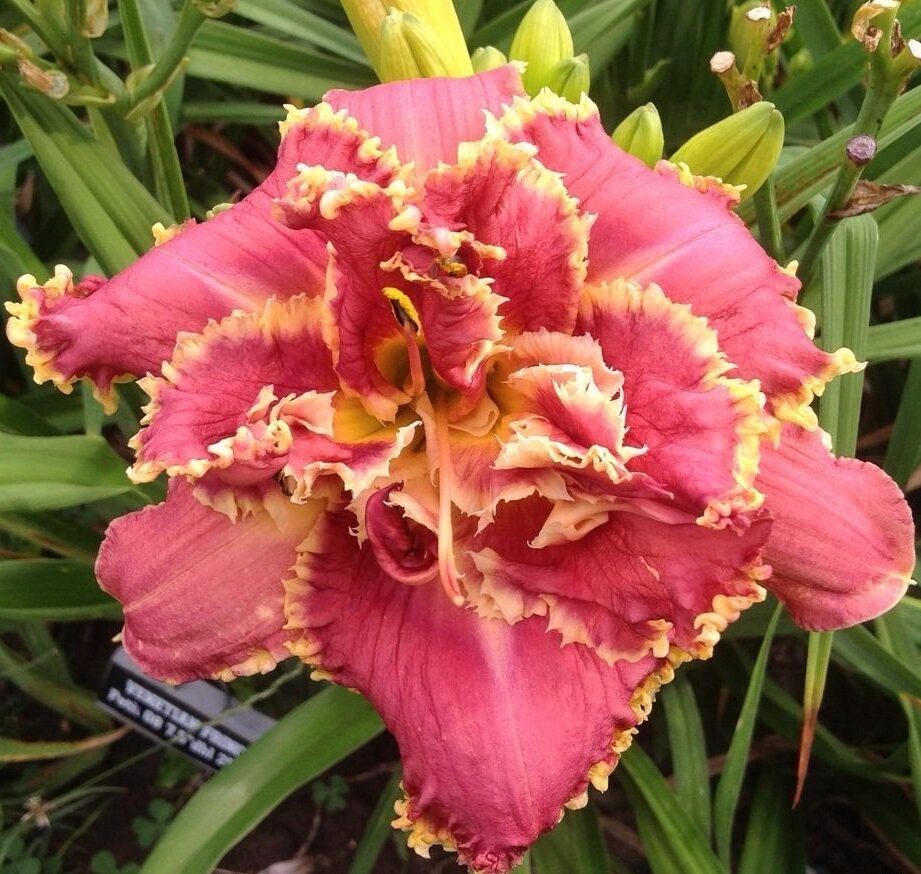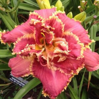 Огромные многослойные цветки (19 см в диаметре). Края лепестков оторочены контрастной сливочной каймой гофрированной и бахромчатой одновременно. Произведение цветочного кружевного искусства. До 20 бутонов на цветоносе. Высота 60 см.