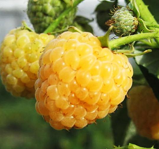 Ягоды плотные, сферической формы, весом до 8 г. Кожица окрашена в золотисто-желтый цвет. Костянки мелкие, прочно соединены друг с другом. Мякоть сладкая на вкус, с легкой кислинкой. В засуху сахаристость немного снижается. Аромат приятный, малиновый.