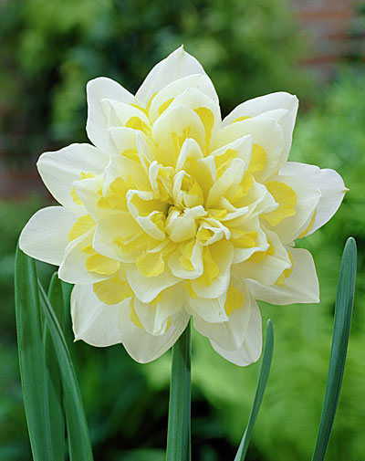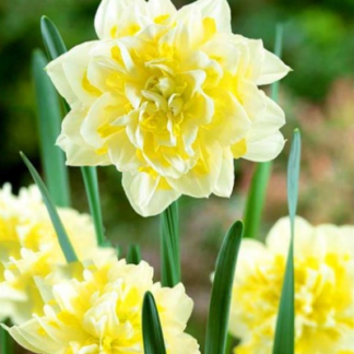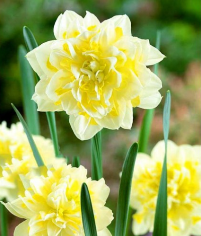 Луковицы махрового нарцисса небольших размеров. Из них вырастает куст высотой 35 – 45 см. Стебель крепкий, прямостоячий. На нем образуются крупные многослойные цветки, источающие тонкий и ненавязчивый аромат. Лепестки окрашены в бело-желтый цвет. Диаметр полностью распустившегося бутона равен 8 – 10 см.