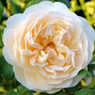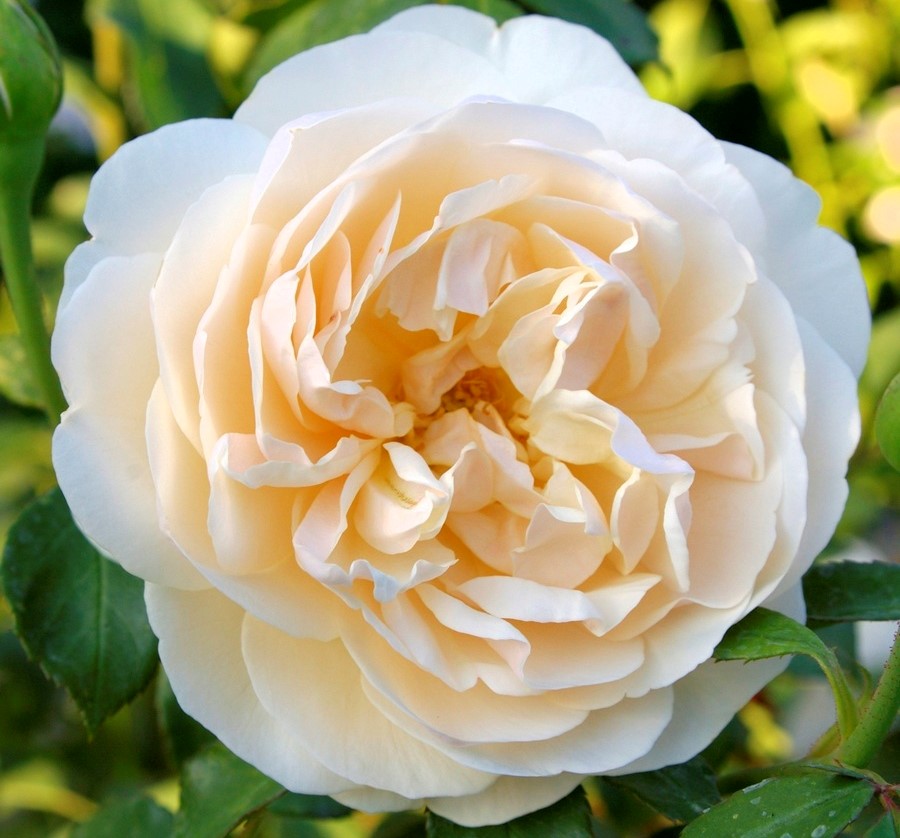 Бутоны персиково-розовые; раскрываясь, они превращаются сначала в чашевидные розетки из плотных (“восковых”) лепестков кремово-абрикосовых оттенков. По мере раскрытия цветка его более крупные внешние лепестки отгибаются вниз, создавая в итоге крупный кремово-белый помпон. Аромат легкий, приятный. Цветок держится довольно долго (около недели), цветение повторное. Куст большой, округлой формы, с чуть поникающими малошипными ветвями.