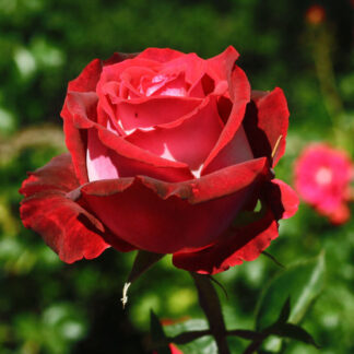 Саженцы этого сорта вырастают длиной 80 см и диаметром 70 см. Куст раскидистый, с прочными побегами. Последние по всей длине покрыты острыми шипами. Листья темно-зеленые, плотные и мясистые. Бутоны изящные, крупные, классической бокаловидной формы. Лепестки махровые (по 40 штук в бутоне). В верхней части они красные, а в нижней белые, с розовой окантовкой. Цветение пышное и продолжительное (вплоть до заморозков). Роза источает приятный и ненавязчивый аромат.