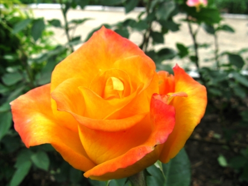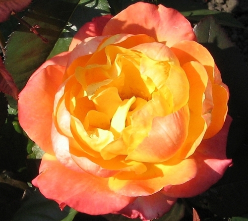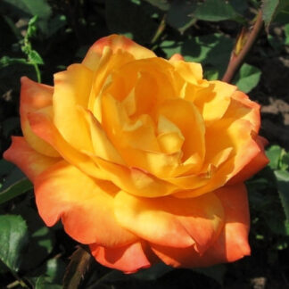 Куст вырастает компактным (высотой до 90 см и шириной около 40 см) и прямостоячим. Листья мясистые, насыщенно-зеленые, с глянцевым блеском. Распустившийся бутон густомахровый (40 – 45 лепестков), плотный, диаметром 10 – 12 см. На каждом цветоносе образуется по 1 – 3 розочки. Окрас лепестков ярко-желтый, плавно преобразующийся в алый. Причем цвет бутонов меняется в зависимости от погоды. Цветение пышное и непрерывное. Аромат приятный, едва уловимый.