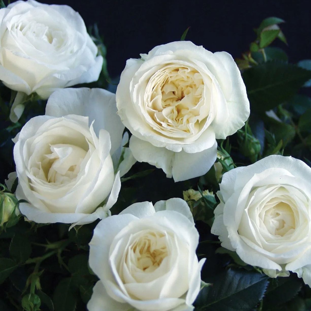 Куст мощный, правильной формы, не слишком высокий. Листья плотные, темно-зеленого цвета, с блестящей поверхностью. Цветы крупные, чашевидной формы, густомахровые. Лепестки сияют белизной. Множество бутонов густо покрывают весь куст. Период цветения длится практически без перерывов. Роза долго стоит в срезке и источает приятный фруктовый аромат (персика, груши и прочих экзотических плодов).