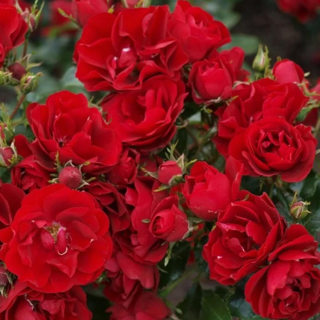 Куст вырастает компактным, высотой не более 50 см. Весь сезон он густо покрыт махровыми цветками (около 20 – 22 лепестков). Распустившиеся бутоны окрашены в ярко-красный цвет. Ширина цветков равна 6 см. Обычно они собраны в соцветия-кисти. Прямые и прочные побеги хорошо удерживают вес раскрывшихся бутонов. Они покрыты сочной, насыщенно-зеленой листвой, с глянцевым блеском. Аромат у розы нежный и ненавязчивый.