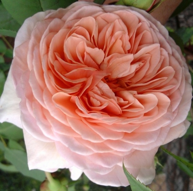 Форма цветка как у большинства английских роз чашевидная и симметричная. Лепестков насчитывается не менее 40 штук. Ширина раскрывшегося бутона равна 10 – 12 см. Цвет у него перламутрово-розовый или абрикосовый. Постепенно он немного осветляется. Цветение длительное, ремонтантное (до первых заморозков). Аромат сильный, с нотками байхового чая. При качественной агротехнике на кусте образуется много бутонов.